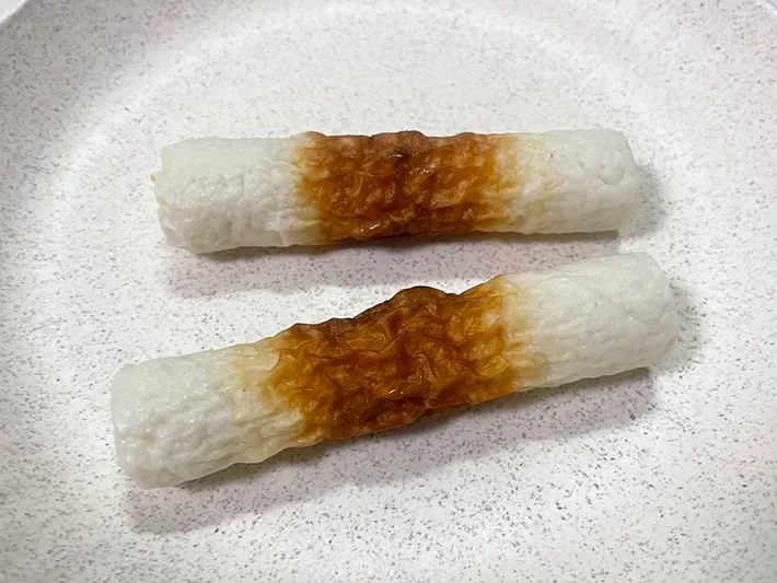 ヤケドに気をつけてちくわを巻いたら、竹串などを刺していったん冷ましますよ。