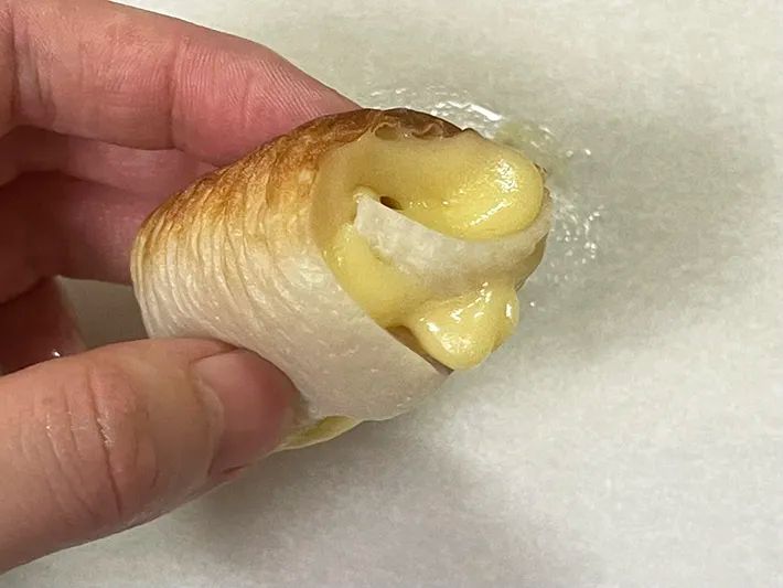 筆者は竹串を本体にしか刺しておらず、加熱後に切り株部分のロールが外れて、ぱっくり開いてしまうアクシデントが発生しています…。