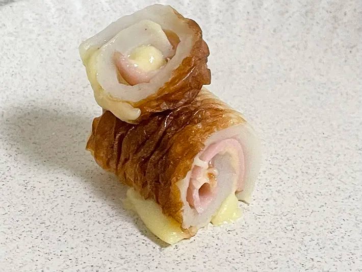 筆者は、彩りを出すためのロースハムと、食材を引っつけて形をキープするためのスライスチーズと一緒に、ちくわを巻いてみることにしました。