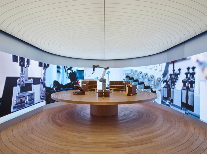 〈アトリエ〉では、メゾンが誇る高い技術力とクラフツマンシップを、職人のデモンストレーションにより間近で見学することができる。〈耐久性試験〉は、耐久試験に使用するトランク測定器「ルイーズ」にオマージュをささげた展示。クラフツマンシップの芸術性と工学性の両立など、メゾンの完璧さを追求する姿勢に圧倒されるだろう。