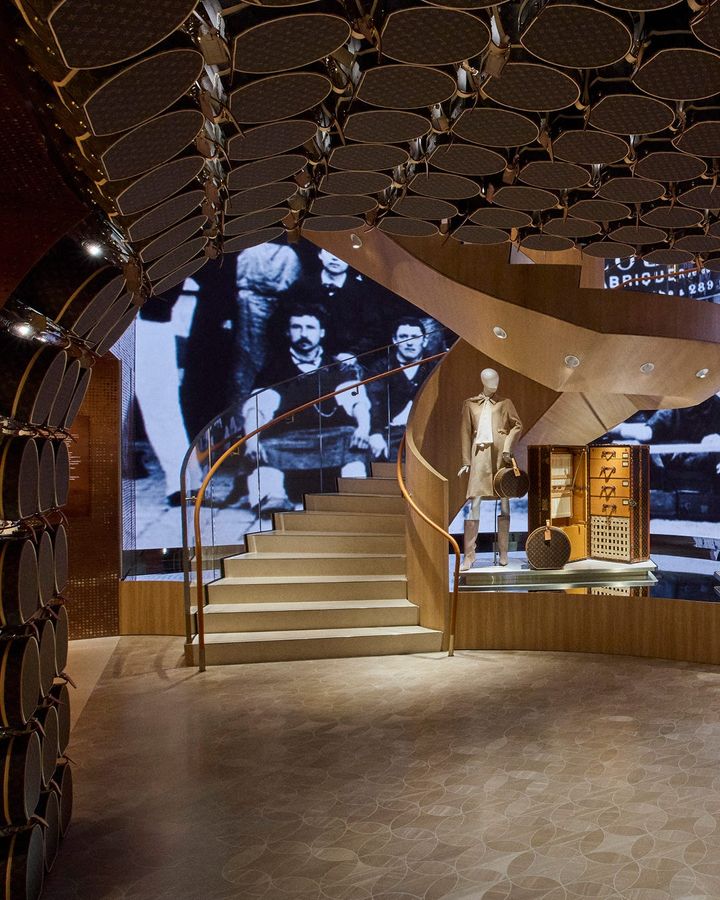展覧会は、5階の〈オリジン〉から始まり、メゾンの歩みを6つの章でたどる。ここでは、モノグラムの誕生や、クチュールと旅の関係、輸送や冒険を支えたトランク、先進素材の進化、そしてライフスタイルへの広がりまでを一挙に紹介。