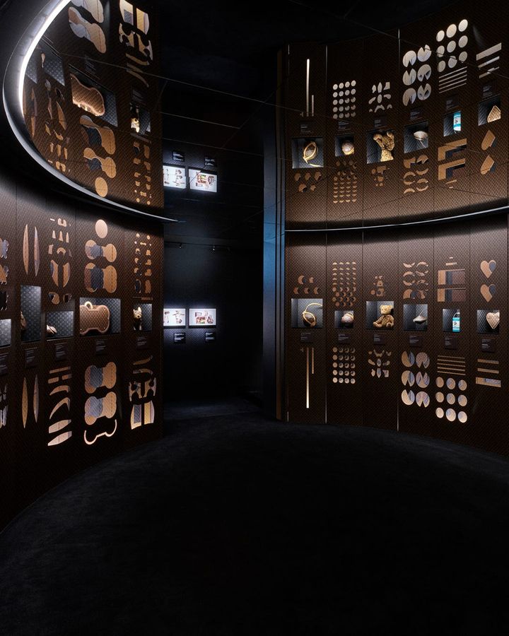 〈モノグラム〉では、天井まで続くモノグラムの壁に、テディベアやブックウォレット、アヒル、サッカーボールなど遊び心あふれるオブジェが並び、メゾンの創造性の自由と楽しさが解き放たれる。