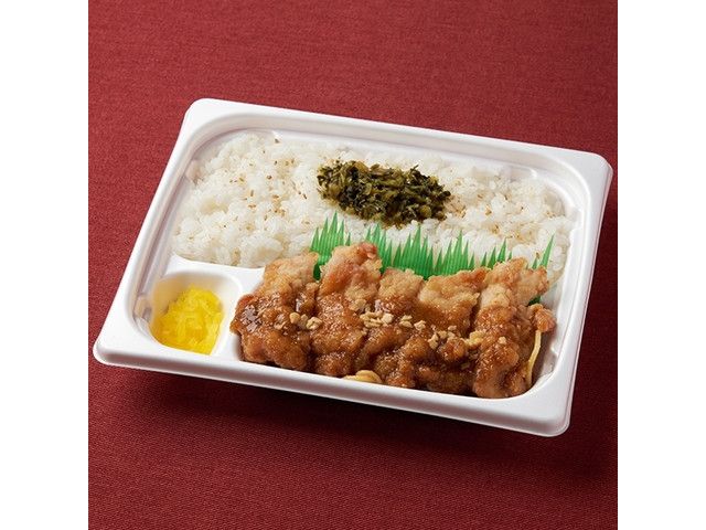 ゆかりをふりかけたご飯に、塩から揚げ・醤油から揚げの2種類の味のから揚げと、照り焼きソースのハンバーグをトッピングしたお弁当です。 北陸で販売