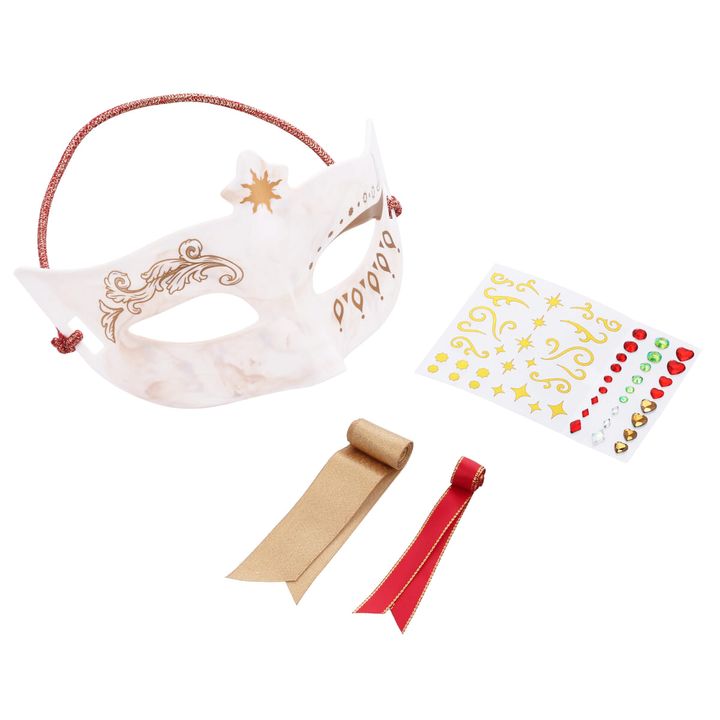 販売されるカーニバルマスクでも装飾パーツやリボンが付属しているので、カルロたちのようにオリジナルのマスクにデコレーションすることができます。