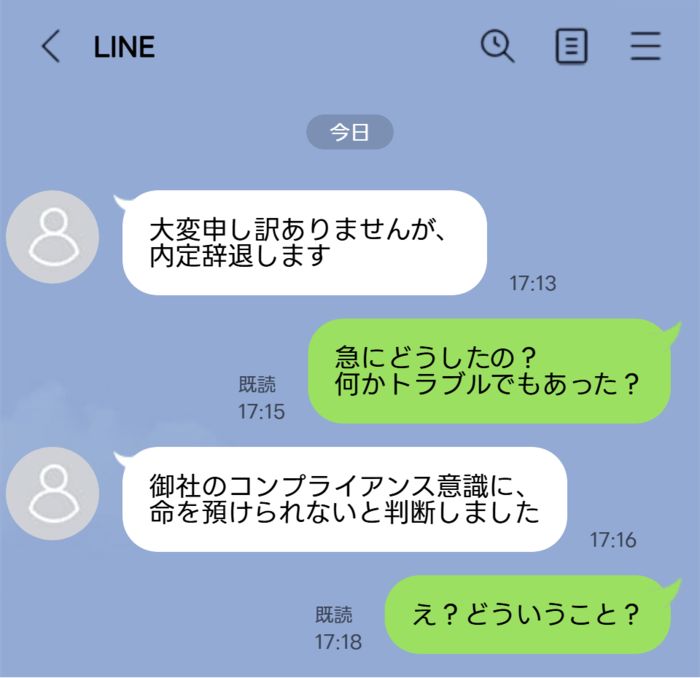 3. 「内定辞退します」入社式前日に届いたLINE。理由を聞くと人事担当が絶句。一体何が?【短編小説】