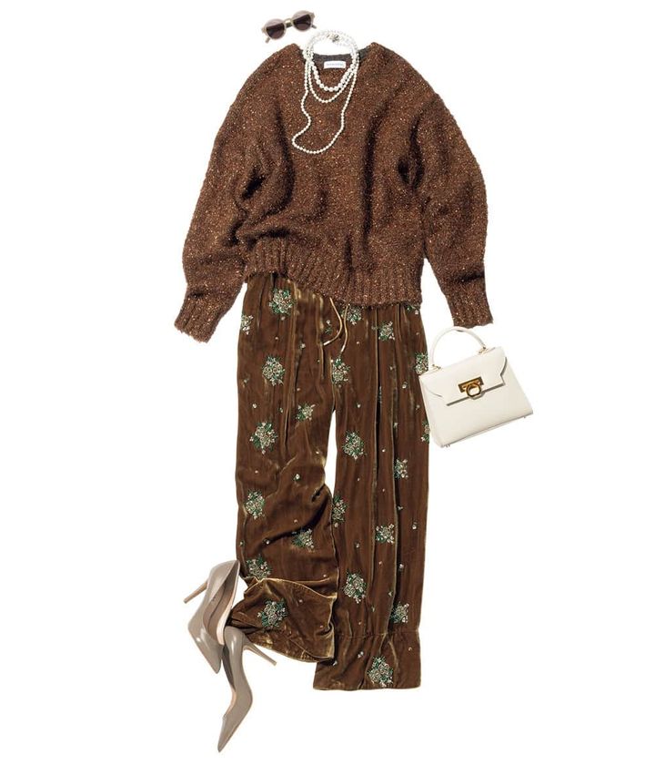 『ベロア×花柄』を茶系でまとめた最旬コーデ。フラワービーズ刺繍×ルーズなワイドデザインは、甘さと抜け感のミックスが絶妙。