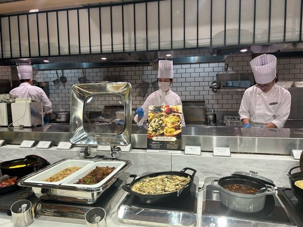 さてお楽しみのビュッフェスタイルの朝食は、和洋それぞれの料理から好きなものを選べ、熱々の出来立て焼きたての抹茶パンケーキ、ラーメン、ベーコンエッグを席に届けてくれるオーダーメニューのサービスもあり朝からテンションが上がります。