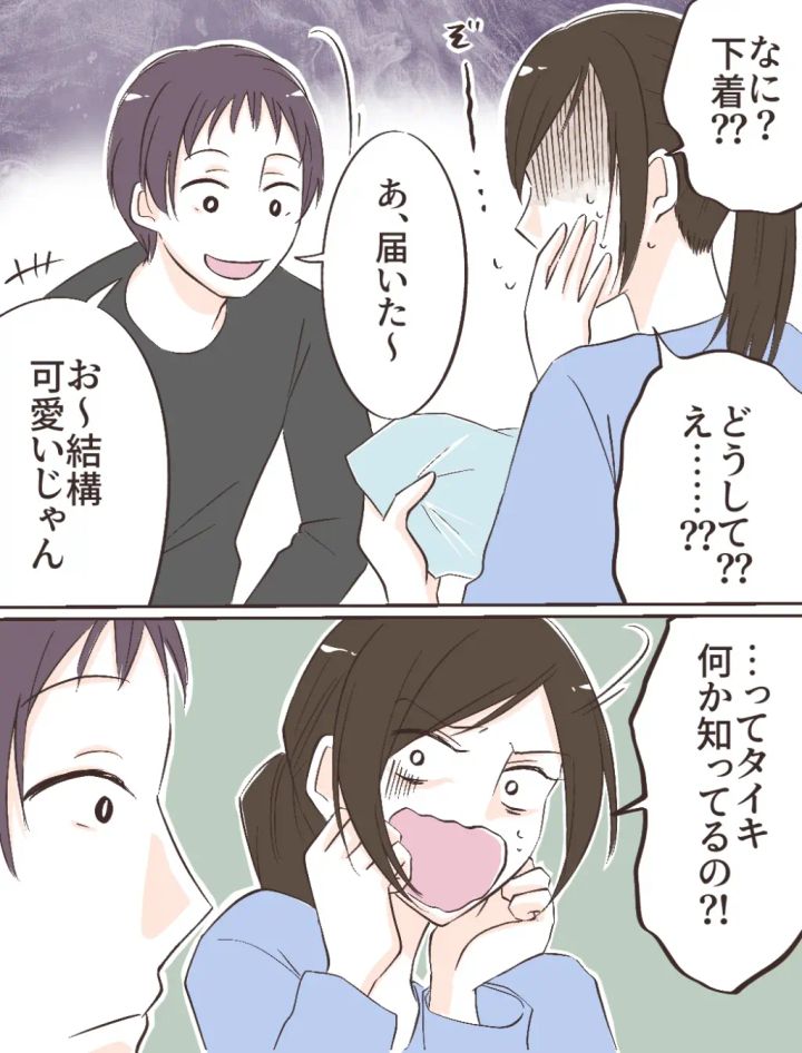「なに?下着??どうして??え・・??」なぜ突然義母から下着が送られてきたのか分からず混乱していると、そこへやってきたタイキが「あ、届いた~。お~結構可愛いじゃん」とさらり。「・・ってタイキ、何か知ってるの?!」タイキのまさかの反応に私はさらにビックリ。