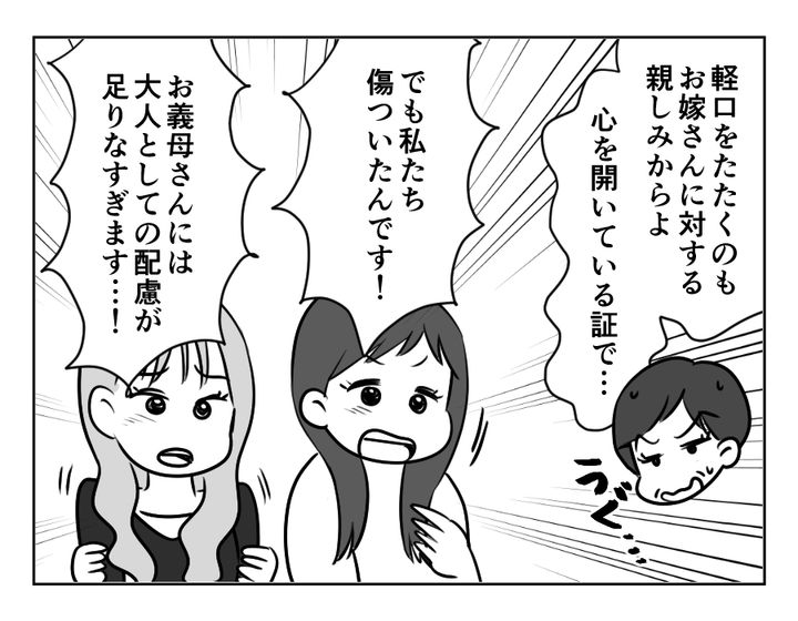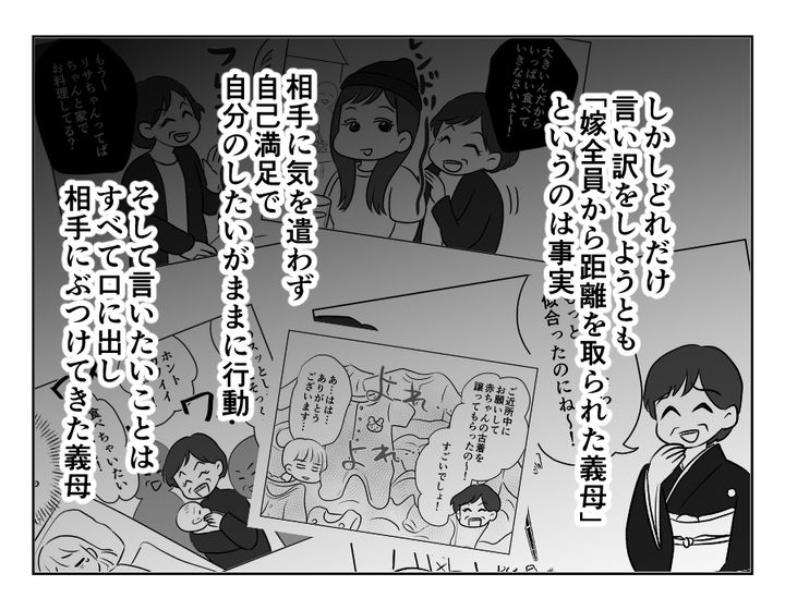 ユウカさんは、デリカシーがなく自分の意見ばかりを押し通すお義母さんに、電話で決別宣言をしました。お義母さんは「ネクラなユウカさんが、うちのノリについてこられなかっただけ」と豪語していましたが、他のお嫁さんたちにも「本当は私たちもイヤだったんです」と疎遠にされてしまいました。