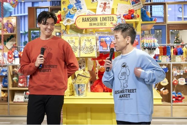 阪神梅田本店6階にオープンしたセサミストリートの物販・カフェ・ワークショップを複合したオフィシャルストア「セサミストリートマーケット」の関西初の店舗阪神梅田本店。営業時間は10時~20時で、約100坪の広々とした店内でゆったりとセサミストリートの世界を満喫できる。2025年12月3日に行われたオープニングセレモニーに、阪神タイガースの湯浅京己選手とますだおかだ増田さんが登場した。
