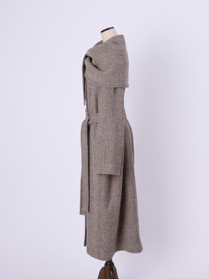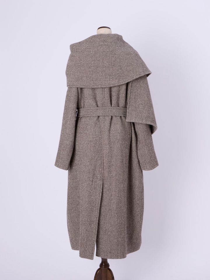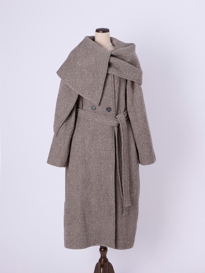 ケープとロングコートがドッキングしたかのようなユニークなデザイン。腕はサイドのスリットから出しても、袖に通してもOK。マフラーのようにも見える首元のディテールはボリューム感のあるデザインで、小顔効果も期待できます。