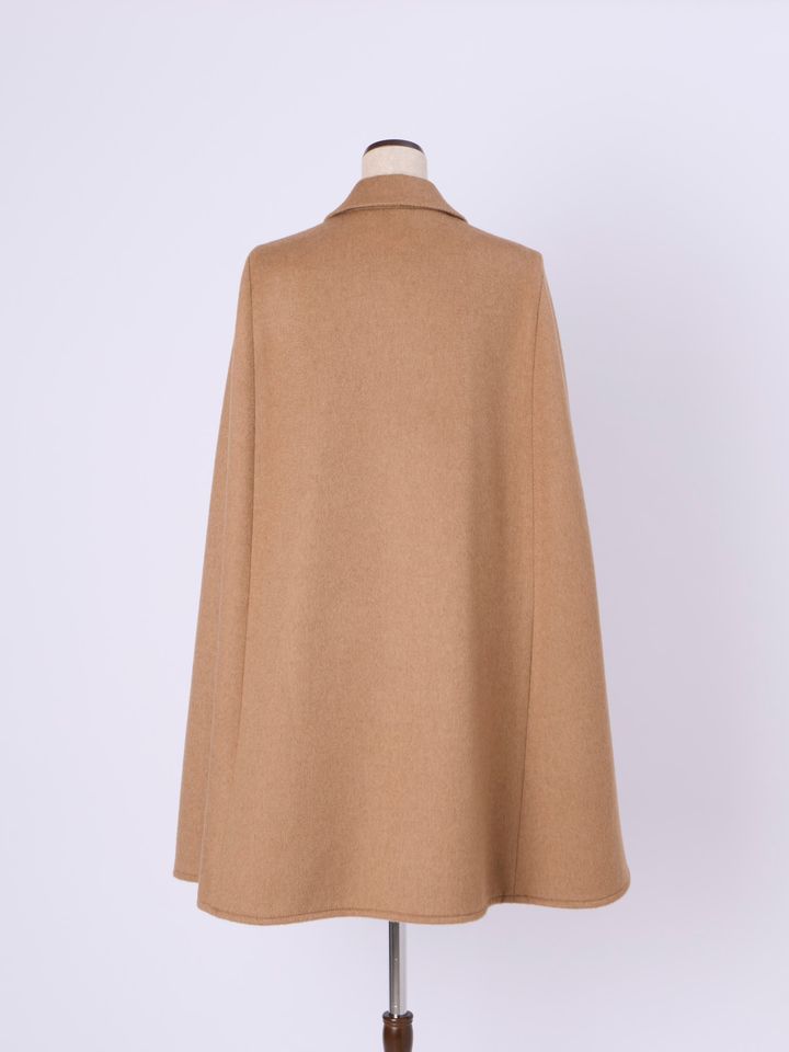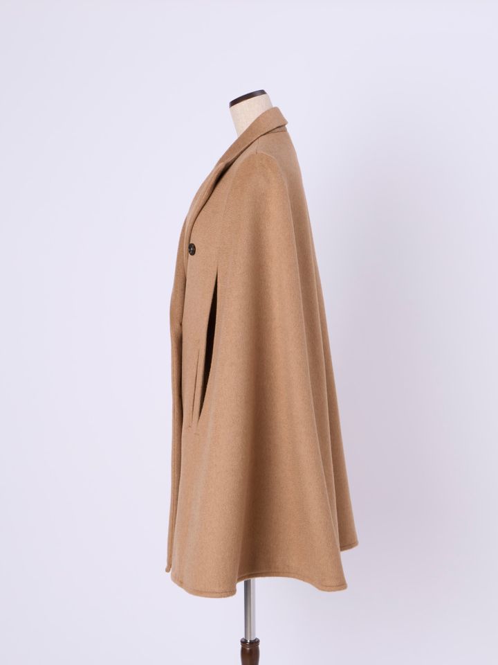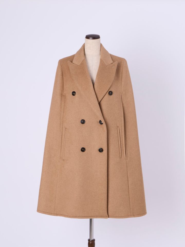 ダブルボタン、ピークドラペルで端正な表情に仕上げたケープ。Aラインに広がるシルエットが華やかで、さっとまとうだけで着こなしがドラマティックに。こっくりと温かみのあるキャメルカラーが冬の装いに最適。