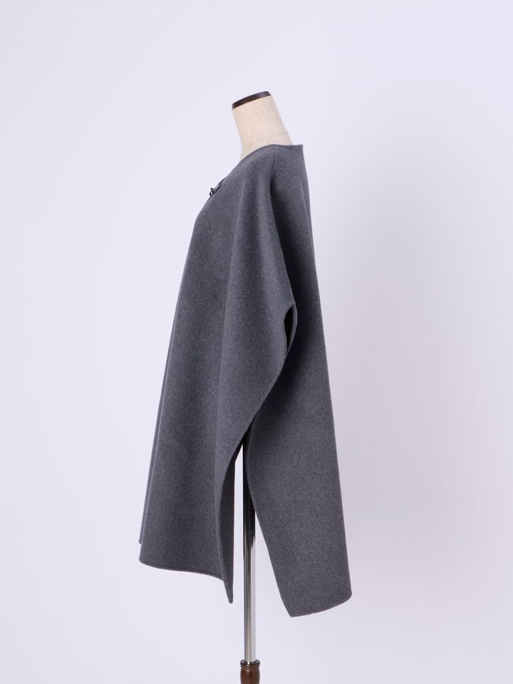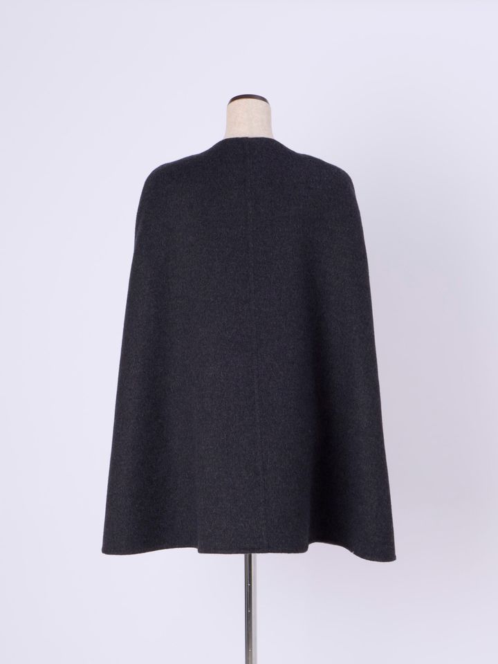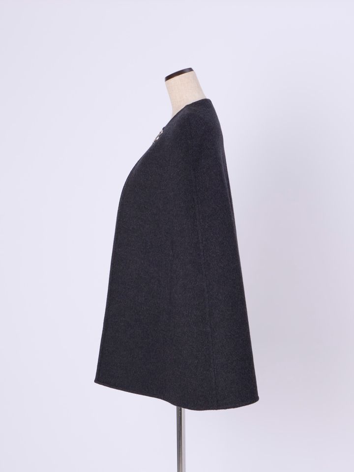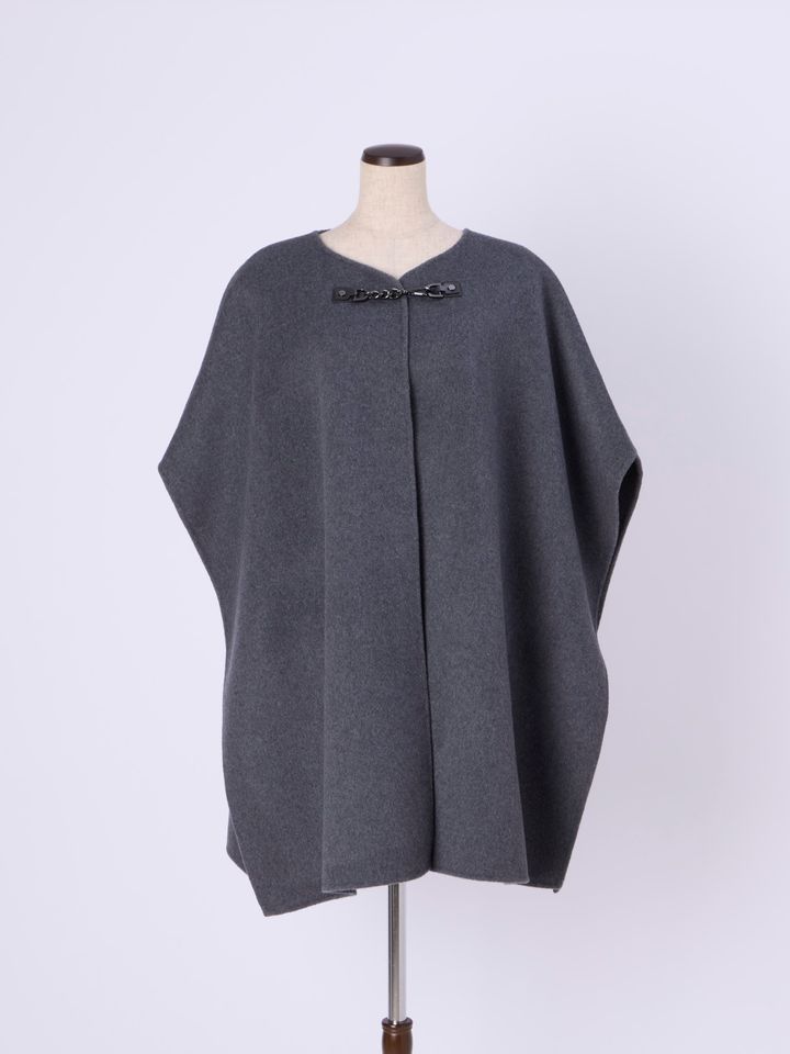 軽やかなダブルフェイスのウール素材、身体にやさしくフィットするゆるやかなシルエット。カーディガンのようにさらりと着こなせるケープは、存在感のあるチェーンの留め具がスタイリッシュなアクセントとして映えます。