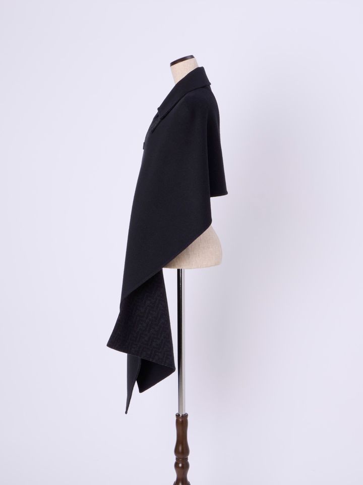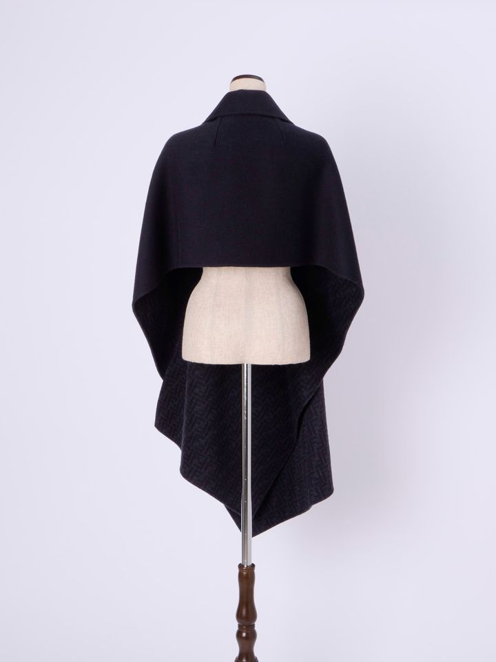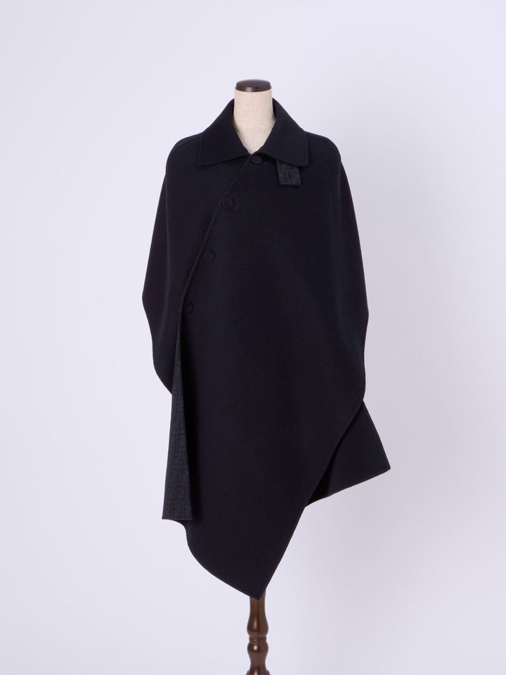 包み込むような優雅なシルエットが美しいマントコート。アシンメトリーなフロントに、リズミカルに並ぶくるみボタンがアクセントになっています。襟元や裾からのぞく、「FF」ロゴのライニングもリッチな表情をプラス。