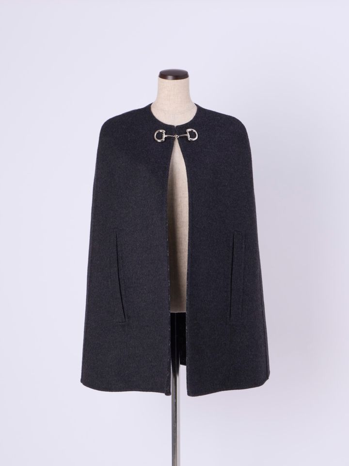 ダークグレーのシルクウールで仕立てたケープ。ミニマル&エレガントな佇まいに、象徴的な“ホースビット”ディテールがクラシカルに映えます。内側のシルクウールにあしらったGGパターンもおしゃれ心をくすぐります。