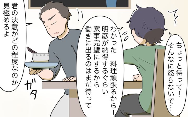 「家事は分担制でいい」と話す明彦に対して、働きに出ることを阻止するため美紅は「明彦が納得するぐらい家事を完璧にする」と宣言してしまい……。