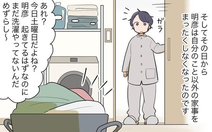 以前は平日も仕事から帰って家事をしてくれていた明彦ですが、私の「家事より稼ぐ担当になって」の言葉以降、帰る時間が遅くなり、現在は土日のみの家事担当となっていました。