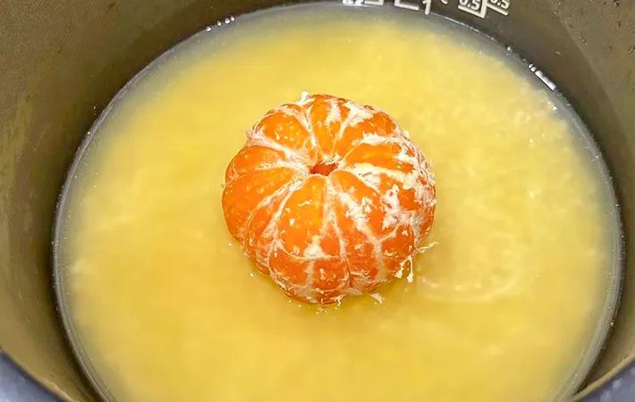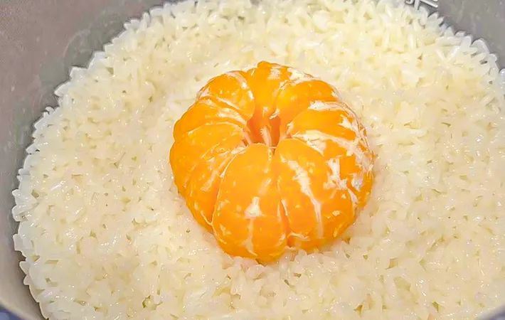そして、そこに皮を剥いたミカンを1個、炊飯器の中央にそっと置きましょう。