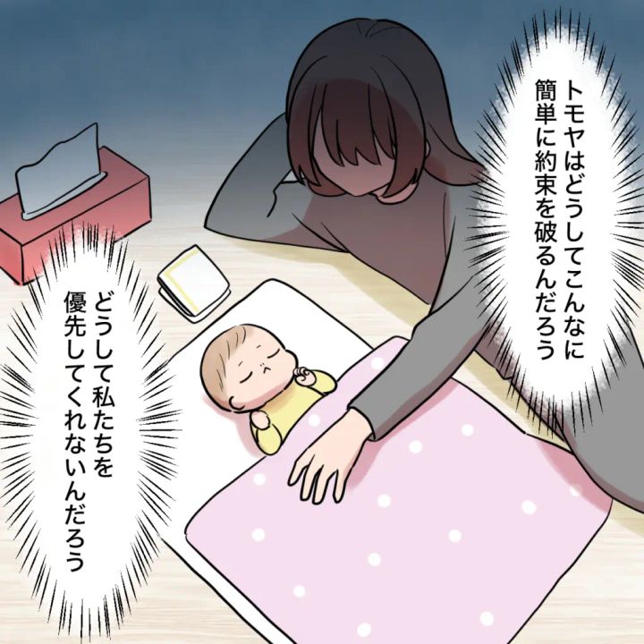 義兄夫婦が離婚することになり、義母とキョウカさんに頼まれて、ソウくんや産まれたばかりのルナちゃんのお世話を手伝っていたと話すトモヤ。「事情はわかったけど、これからは家族を優先してほしい」涙ながらに訴えると、彼は「わかった」と約束してくれました。しかしその言葉も虚しく、トモヤは私をあっさりと裏切り、キョウカさんを優先したのです。