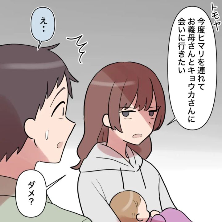 昨日ふと湧き上がった義母への違和感を確かめたくて、私はトモヤに「今度ヒマリを連れてお義母さんとキョウカさんに会いに行きたい」と頼みました。するとトモヤは「え・・」と声を漏らし、驚いたような表情を浮かべます。その反応が気になった私は「ダメ?」と聞き返しました。