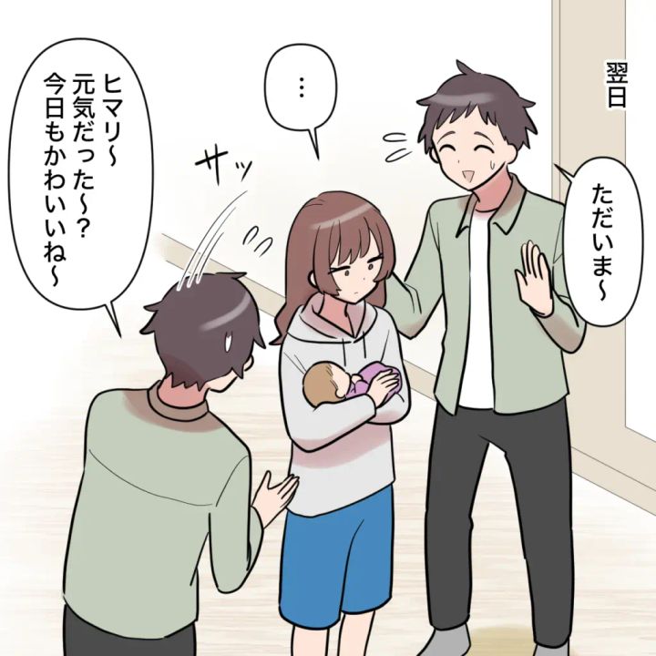 翌日、義母に呼ばれて義実家に行っていたトモヤが帰って来ました。「ただいま~ヒマリ元気だった~?今日もかわいいね~」私が黙ったままでいるのが気になるのか、どこか機嫌を取るような口調で話しかけてきます。こんな態度を取るくらいなら、義実家に行かなければいいのに・・・。