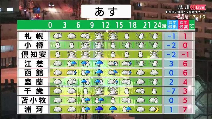 金曜も雪や風が強く、札幌周辺など道央で警報級の大雪や猛吹雪となるおそれがあります。また、金曜はこの冬一番の寒さです。日曜は札幌周辺で再び雪が強まり、月曜はオホーツク海側で荒れるでしょう。