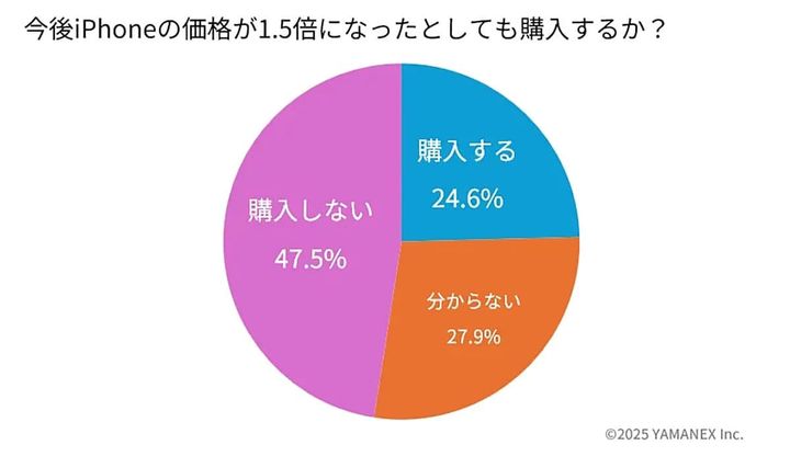 購入理由ではバッテリー持続時間の改善やカメラ性能の向上が多く挙げられています。シリーズ全体への満足度も高く、7割以上が期待通りまたは期待以上と答えました。一方、価格が1.5倍になった場合でも購入すると答えた人は約4人に1人にとどまり、実用性を重視しつつも価格への慎重な姿勢がうかがえます。