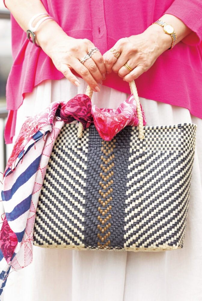 「メルカドバッグに白、スカーフにピンクや赤と小物にも洋服の色を取り入れ、コーディネートがまとまるよう意識しました」