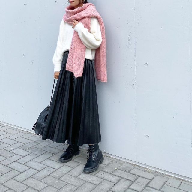 マット肌で青みを感じる肌のブルベ夏さんは、穏やかなトーンで青みのある色が似合います。そこで選びたいのは繊細なイメージを生かした優しい色。淡いピンクのマフラーはまさしくベストマッチです♪