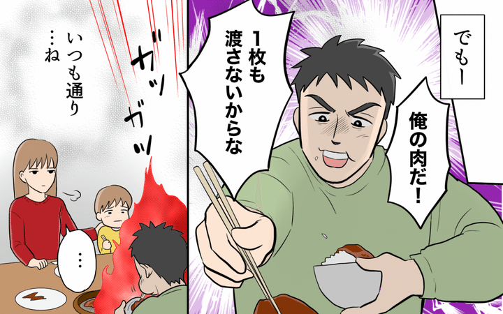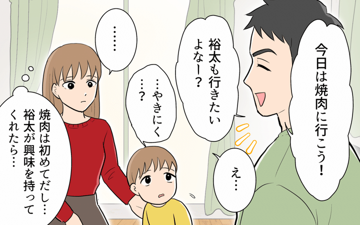 初めて家族で焼肉屋さんに行くことになり、夫がどういう態度を取るか観察していたのですが…。夫はいつも通りお肉を独り占めしていました。私や息子の箸が動いていないことに気づくこともなく、がっついてお腹いっぱいになったら帰ろうと言い出す…。