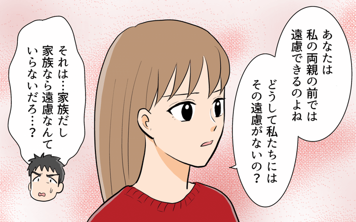 夫は自分の何がいけないのかまったくわかっていないようで、二言目には「家族だし」「家族なら遠慮はいらない」と言います。家族からなら奪ってもいいと思っている、その思いやりのなさが私はもう許せませんでした。