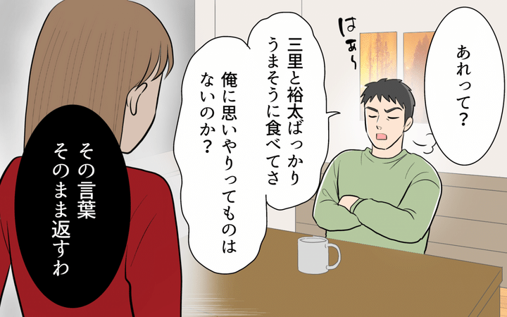 その後箸が止まった夫を見てから食べ始めた私と息子。その間、夫はずっと不満そうな顔をしていました。「思いやりがない」とまで言われましたが、その言葉、そのまま返します。