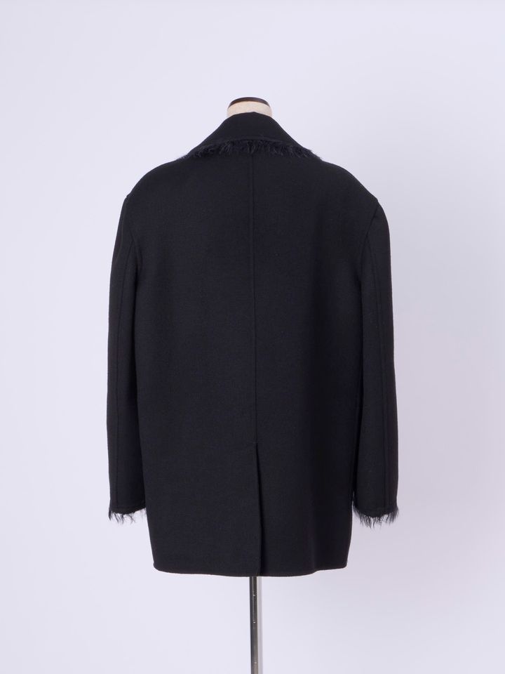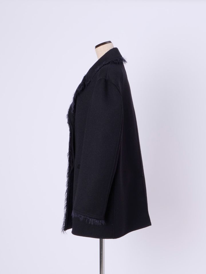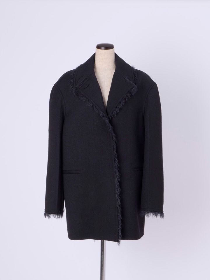 上質なウールギャバジン、比翼仕立てのクリーンなデザイン。オーセンティックな雰囲気に、リラクシーなシルエットがこなれ感を生み出しています。袖口や前合わせなど、さりげなくのぞくフリンジがモダンな温もりをプラス。