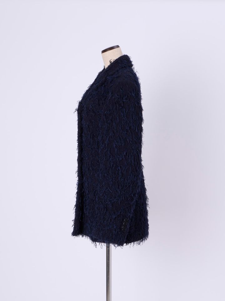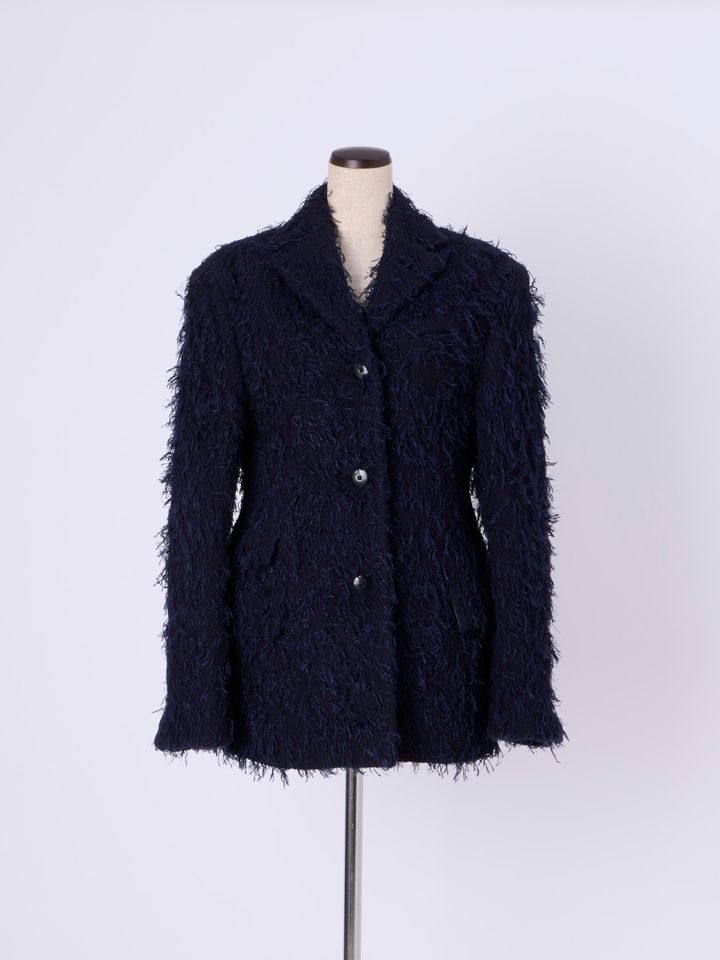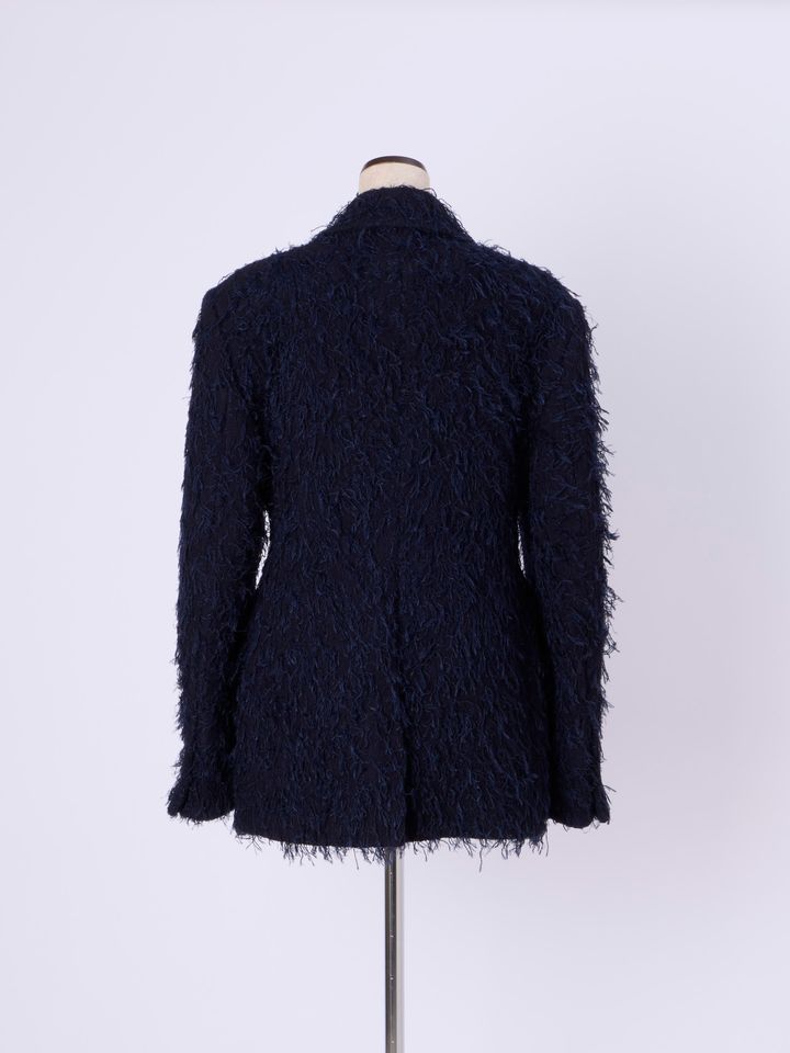 2025年秋のランウェイに登場したテーラードブレザーをユニークなテクスチャーでアップデート。フリンジを直接織り込むことで、毛足の長いファーのような質感に。シックなネイビーのワントーンに、フラッフィな遊び心が映える一着です。