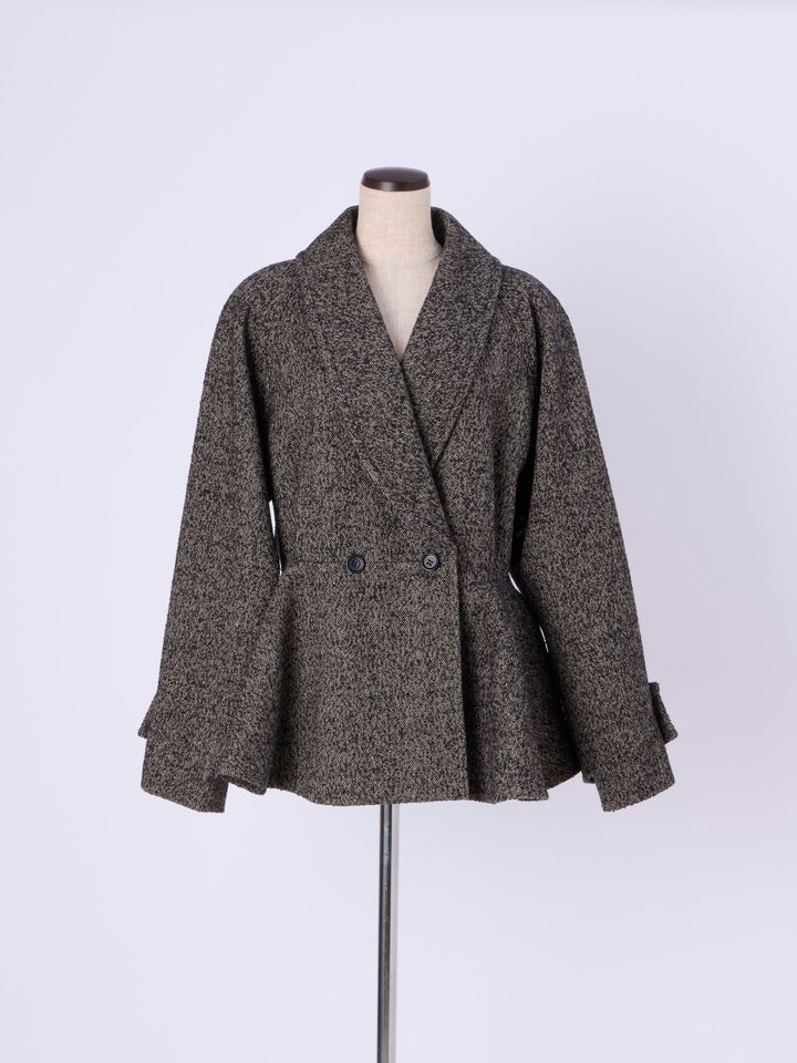 ボリューム感のあるペプラムシルエットは、華やかさだけではなくスタイルカバー効果も抜群。ショールカラーがリラクシーな魅力をプラス。