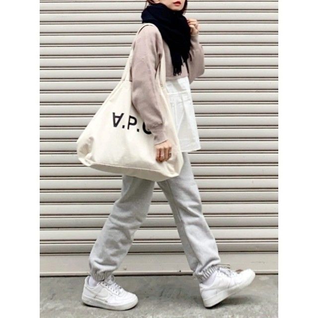 青マフラー×白っぽい色のコーデ