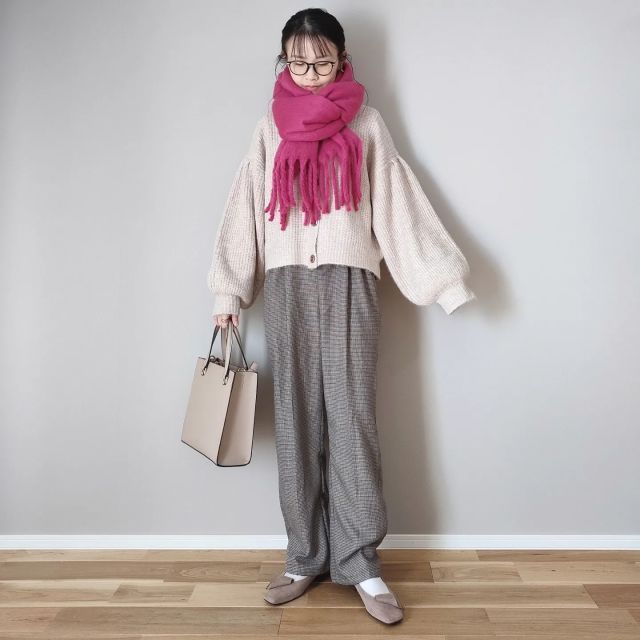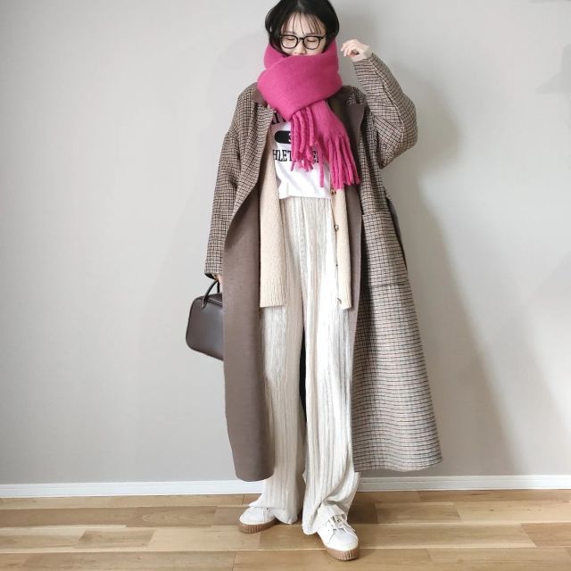 発色のいいピンクのマフラーと似合うのが「ベージュ・ブラウン系コーデ」。ナチュラルカラーの服がピンクマフラーの甘さを払拭して、派手見えも中和。マフラーが悪目立ちせずに大人っぽく仕上がります。