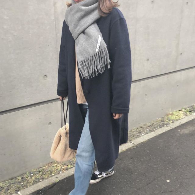 グレーマフラー×デニムパンツのコーデ