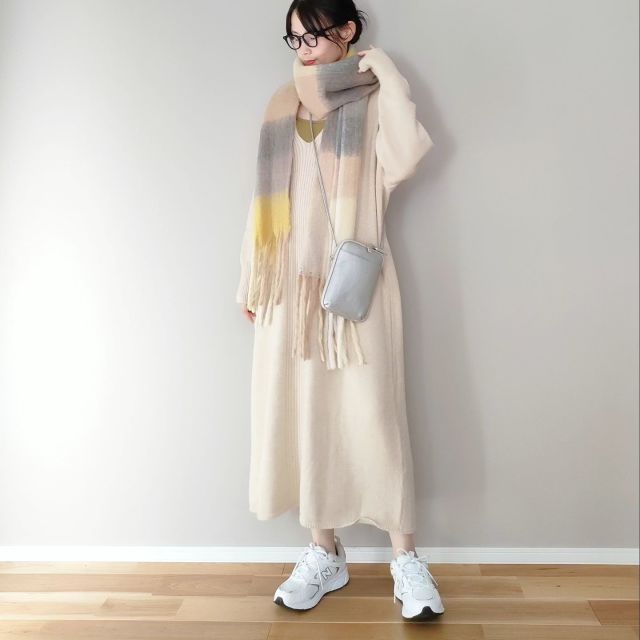 チェック柄マフラーは「柄の中の1色」と同じ色の服に合わせましょう。特にチェック柄から拾った色をワンピースやロングコートなど布面積の広い服で取り入れると、コーデに馴染みやすくなります。チェック柄がしっくり溶け込み上品な装いに。