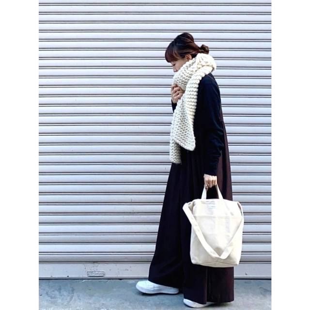 白マフラー×黒っぽい色のコーデ