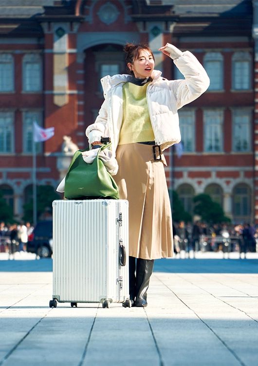 パデッドブルゾン¥5,990/GU タートルネックインナー¥2,290/UNIQLO:C(UNIQLO) 2WAYニット¥26,400/マイストラーダ サイドプリーツスカート¥24,200/アルページュストーリー トートバッグ¥75,900/ジャンニ キアリーニ(ジャンニ キアリーニ 銀座店) ロングブーツ¥79,200/ファビオ ルスコーニ(エリオポール代官山) ニット帽¥3,990/アンフィーロ(オンワード樫山) 大判ストール¥4,390/ZARA(ザラ) ゴールドイヤカフ¥9,240/TIGRIS(ロードス)