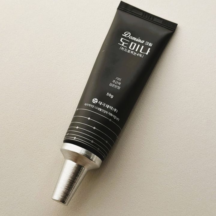 色素沈着、シミ用の美白クリーム。ハイドロキノン4%配合で、夜のみ使用します。塗り広げるのではなく、シミ部分にのせる感じで使用するのがよいとのこと。ノズルも細く狭く、パッケージも硬いので、ギュッと押したつもりでも少量ずつしかクリームが出てきません。クリームを使用中は日光NGなので、起きたらすぐに洗顔して日焼け止めを塗ること。日中もOKの白いパッケージのハイドロキノン2%クリームもありましたが、せっかちなのでこちら一択で。