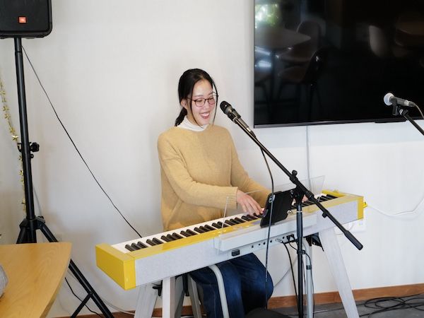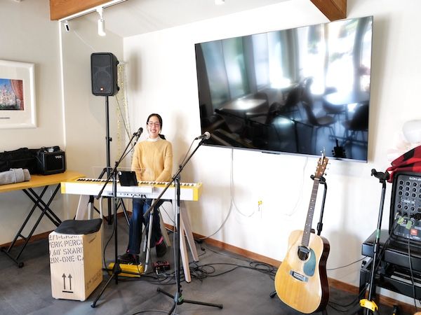 5歳からピアノを習っており、音楽塾で作詞作曲やヴォイストレーニングを受けていたという美六さん。この日も歌いながら(!)お話を伺いました。注文を受ける時の声と、店内にひろがる伸びやかで重厚な歌声のギャップに驚きました。電子ピアノとスピーカーは小串さんの持ちもので、ギターやマイクなどはレンタルだとか。