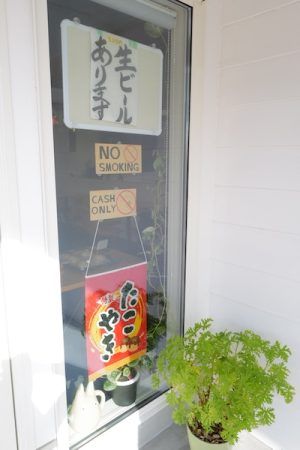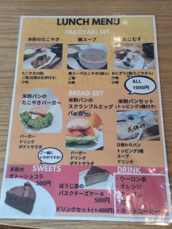 この日もお昼ご飯にたこやきを食べられることにウキウキしつつ、『米粉のたこやき ソース(単品8個  税込750円)』と『鯛スープたこやき(3個入り・ご飯なし  税込650円)』を注文しました。お支払いは現金のみ。ケーキは日替わりで、この日は「ブルーベリーケーキ」と「米粉のガトーショコラ」でした。ちなみにビールや酎ハイなど「明るい時間からちょっと一杯」の昼呑みも可能です。
