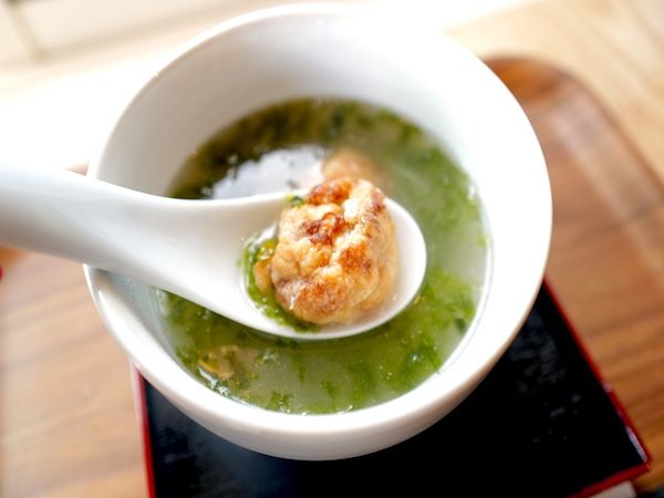 外が寒かったので、まずはスープから頂きます。こちらのたこやきは、スープに入れても形が崩れないよう火の通し方を工夫しているそうです。口に含むと、塩気を吸ったふわふわのたこやきがゆっくりと崩れていきます。熱い汁も冷えた身体に染み渡りました。スープに浮かぶのは、広島の焼き海苔だそうです。汁物にたこやきを入れるという発想がなかったのですが、時間が経ってふやけたたこやきが思いの外美味しくて、おでんや煮物にも合いそうだなと思いました。
