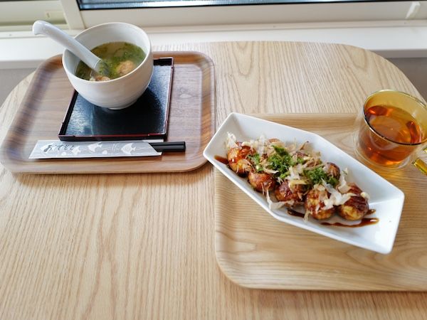 最初に写真左の『鯛スープたこやき』、少ししてから『米粉のたこやき ソース』が運ばれてきました。湯気の立ったスープとたこやきに思わず「うふふ」と声が漏れます。