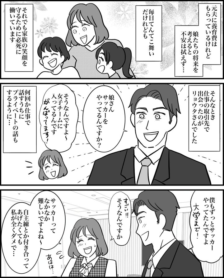 私は子どもたちの笑顔を守るために必死で働いていました。そんなとき仕事を通じてリョウタさんと出会ったのです。サッカーの話題をきっかけに次第にお互いのプライベートな話をするようになり、娘たちとも交流がはじまりました。