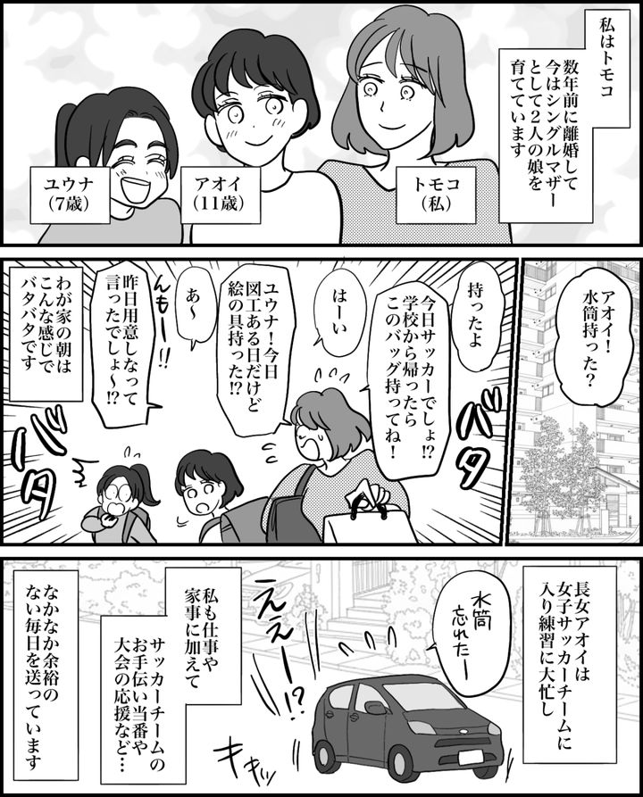 私(トモコ)は、数年前に元夫と離婚しました。離婚後は元夫から養育費を受け取りながら、女手ひとつで2人の娘を育てています。贅沢ができる状況ではありませんが、家族3人で力を合わせて仲良く暮らしていました。現在は長女のアオイが小学5年生、次女のユウナが小学1年生です。将来への不安は拭えないものの、子どもたちには家庭環境を気にすることなく好きなことに打ち込んでほしいと思っていました。