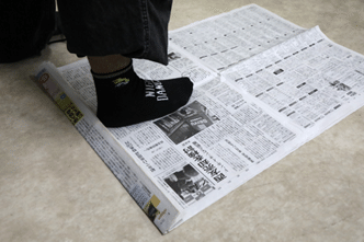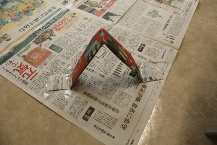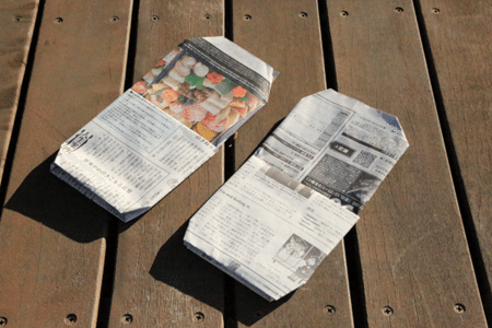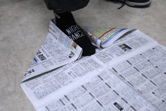 最初は試しにスリッパを作ってみましたが、新聞紙一枚では強度に不安がありました。