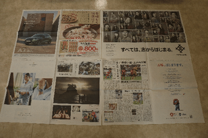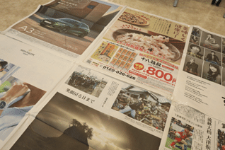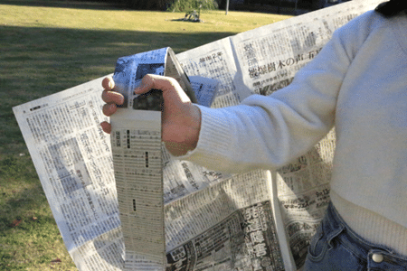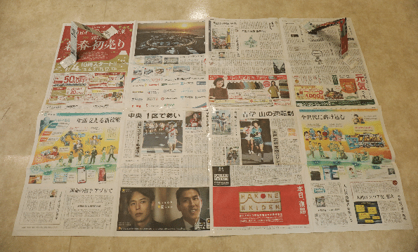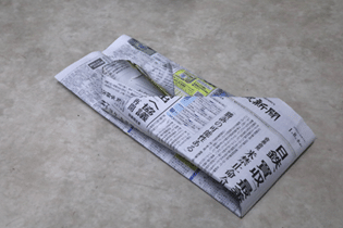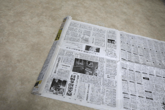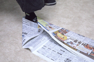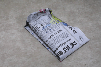 1,新聞紙を三枚重ね、端 を約5cmほど折る